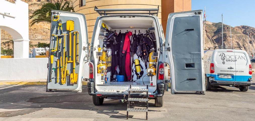 -Equipos de buceo autónomo para trabajos en el fondo y dos compresores de aire de 12 m*/h cada uno para la carga de botellas.